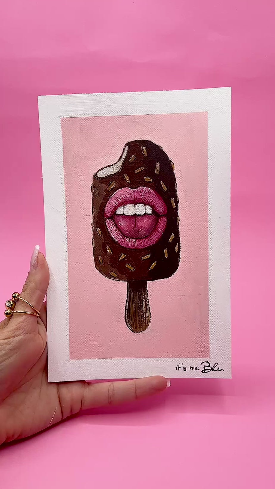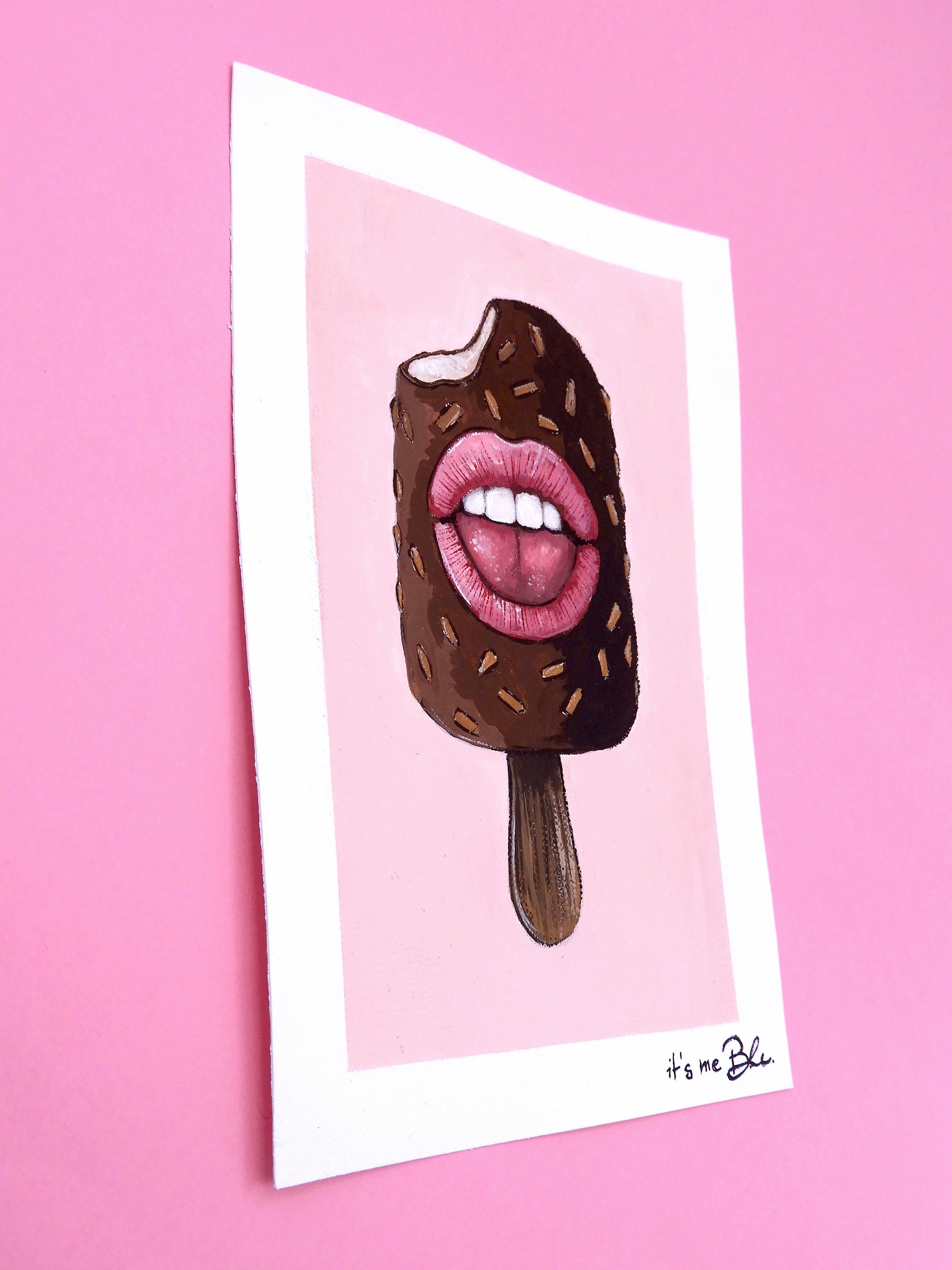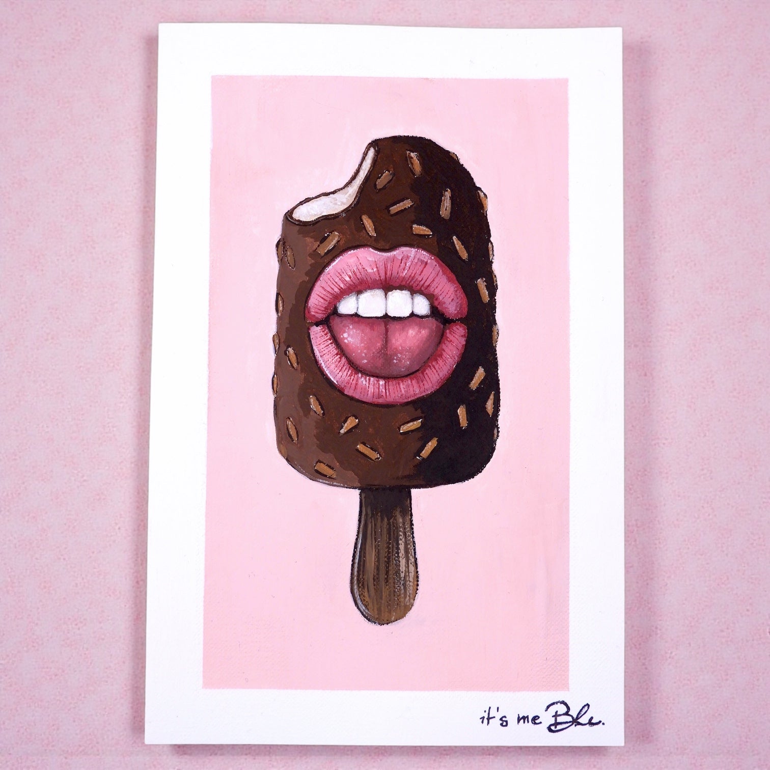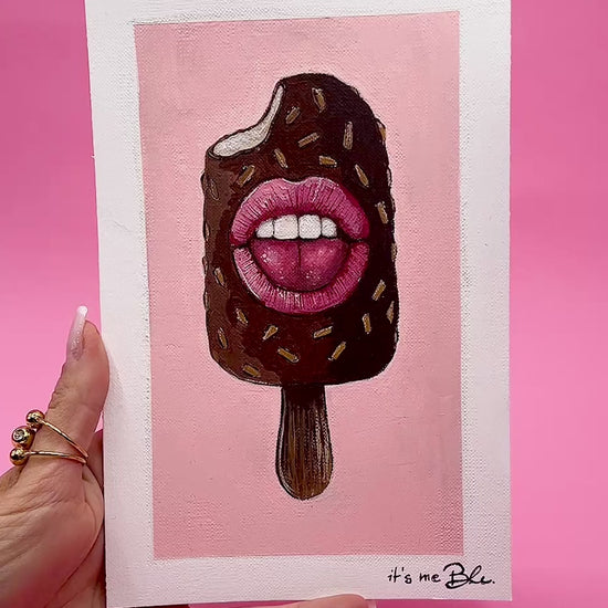 A small pop surreal acrylic painting on canvas paper featuring quirky ice cream stick (Magnum style) with expressive mouth.