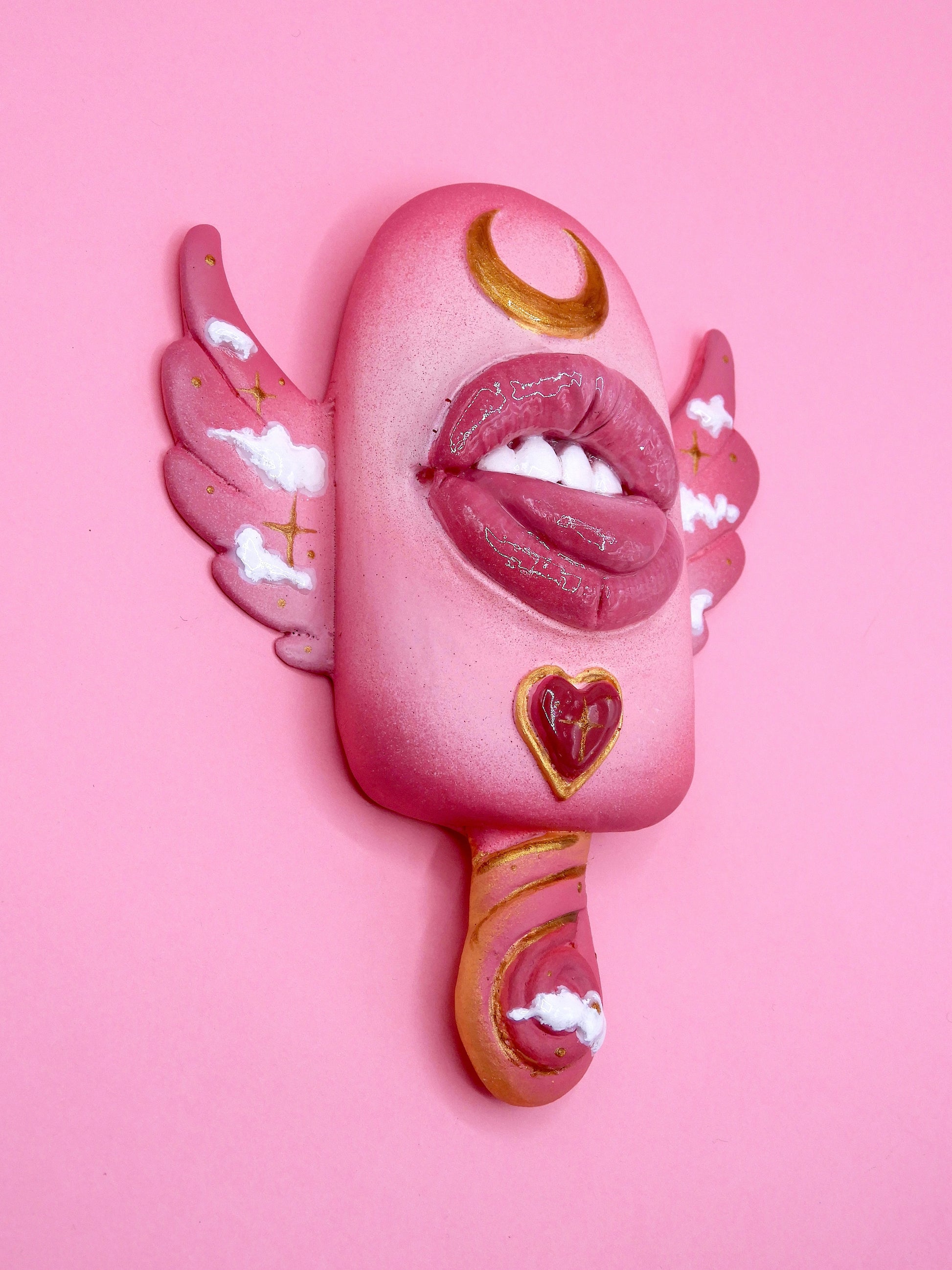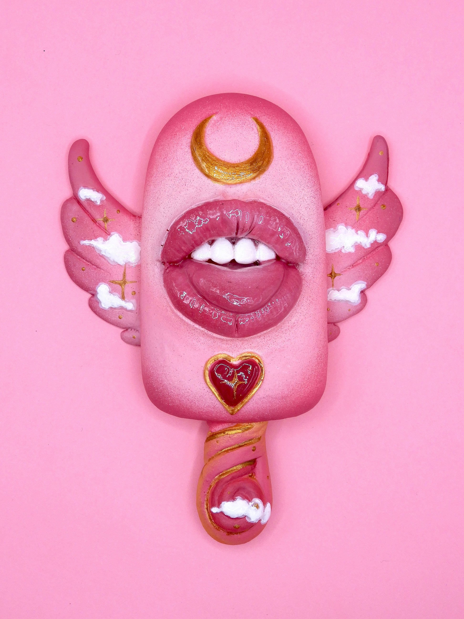A whimsical pop surreal sculpture featuring winged ice cream sticks with a playful mouth. Handmade in polymer clay, cast and refund in resin full of quirky fantasy charm.